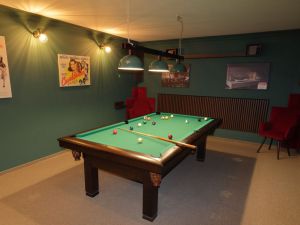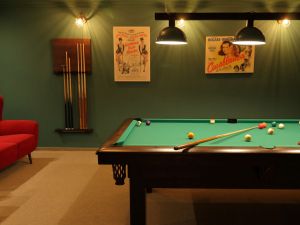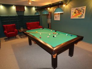 W każdym z domów znajduje się sala bilardowa, utrzymana w iście klubowym klimacie. Na naszych Gości czeka profesjonalny stół bilardowy z polem do gry wykonanym z łupka włoskiego o wymiarach 8ft wraz z całym potrzebnym do gry sprzętem. Odpowiedni klimat zapewnia wystrój nawiązujący do Hollywood lat 40. i 50.
